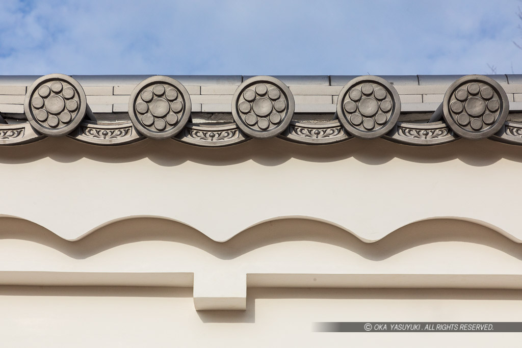 尼崎城模擬土塀の九曜紋の軒瓦|高解像度画像サイズ:6639 x 4426 pixels|写真番号:5D4A4942|撮影:Canon EOS 5D Mark IV